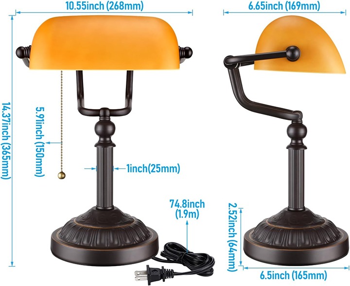 350 °Adjustable Angle: This bankers desk lamp can be freely rotated angle, flexible adjustment of lighting direction; yellow glass lampshade using frosted high-transmittance glass material, reflecting the light evenly and softly to avoid glare