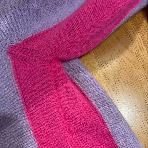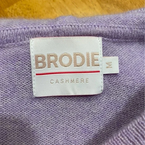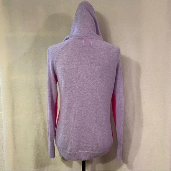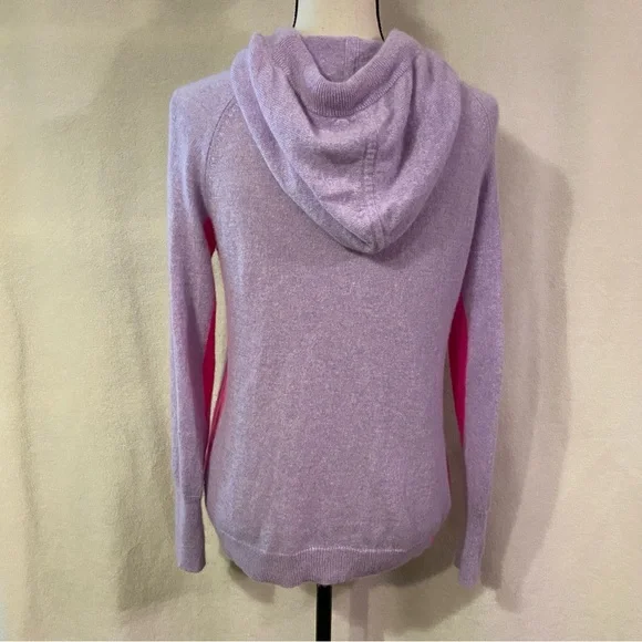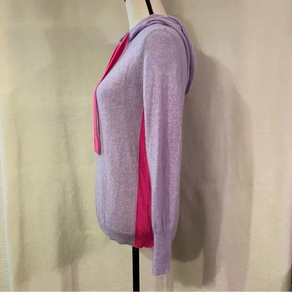 Excellent gently used condition. No stains or holes. No pilling. Brodie cashmere "Ivy" hoodie. A lavender purple knit pullover hoodie with neon pink contrast stripes at sides and ties. Raglan sleeves. Soooo soft. Ribbing at cuffs. Long sleeves. 100% cashmere. Measurements (flat & approximate): bust 18", sleeves 26", waist 18", length 25". Dry clean, hand wash, or wash on delicate, air dry. No trades, please!