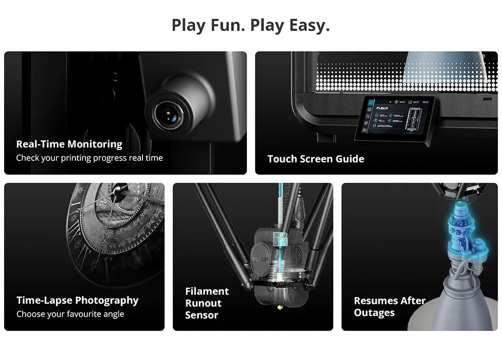 FLSUN T1 Pro is equipped with a high-definition camera, which can realize real-time intelligent monitoring, ensure the speed and accuracy of printing, and take time-lapse photos to record the printing moment.