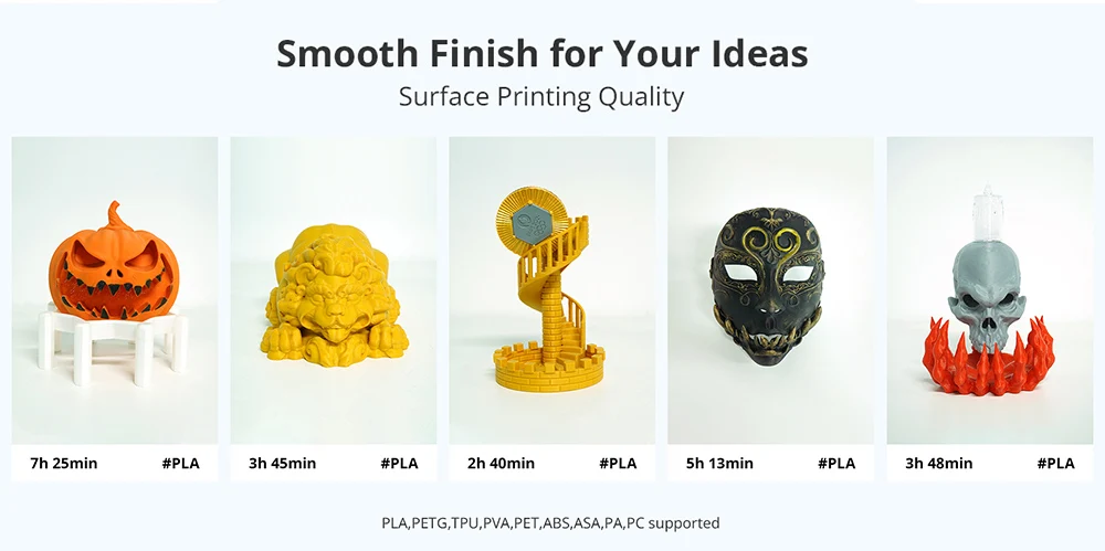 Dual gear direct drive powerful extruder, temperature can reach 300°C, amazing flow rate 90mm³/s, guaranteed printing speed, equipped with outer cover to ensure the temperature of the printing room, suitable for PLA, PETG, TPU, PVA, PET, ABS, ASA, PA, PC and other materials, performance is better than the same type of fdm 3d printer