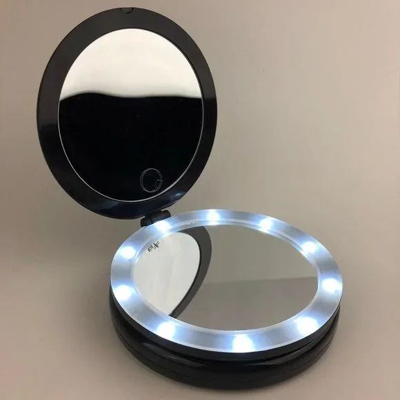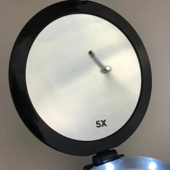 Impressions Elevate XL Makeup Mirror LED Lighted Compact Foldable 5X Magnifyingboth mirrors are 5.25" diameter. one is 5X magnification and the other is regular. pre-owned in great condition. requires 4 AA batteries which are not included. 2 spots on the back of the mirror to use for hanging on a wall if so desired.