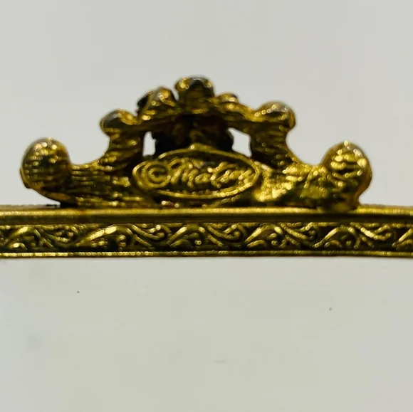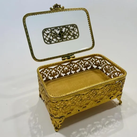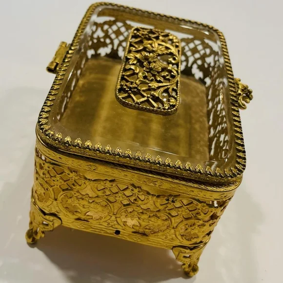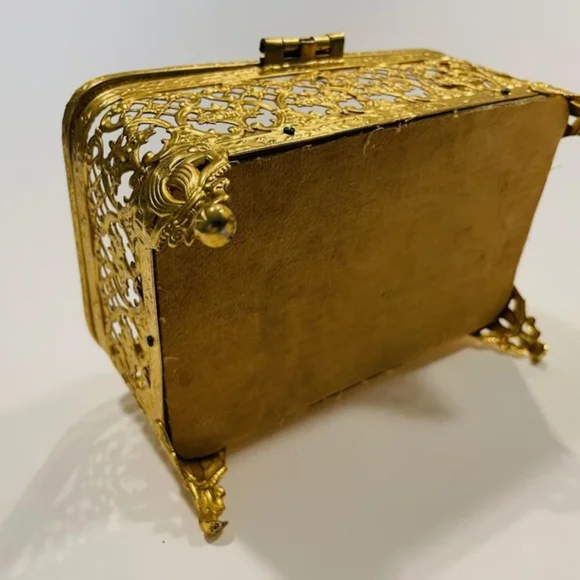 made by Matson in vintage period.excellent condition.hinged , golden metal with golden velvet lining..footed, filigree design,beveled glass center flower Medallion flip top. rectangle design.measuring 5.5" x 3" x 3.5". under the cover signed and copyrighted. see the images for more details. firm price