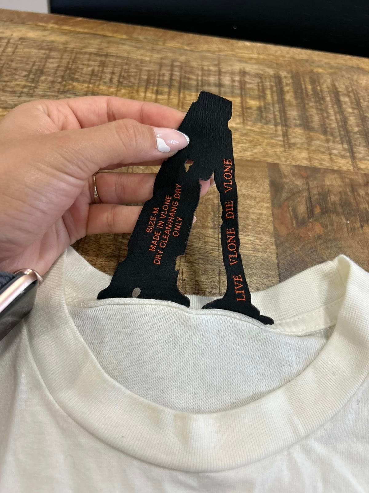 White short sleeve T-shirt featuring a large VLONE graphic logo on the front.