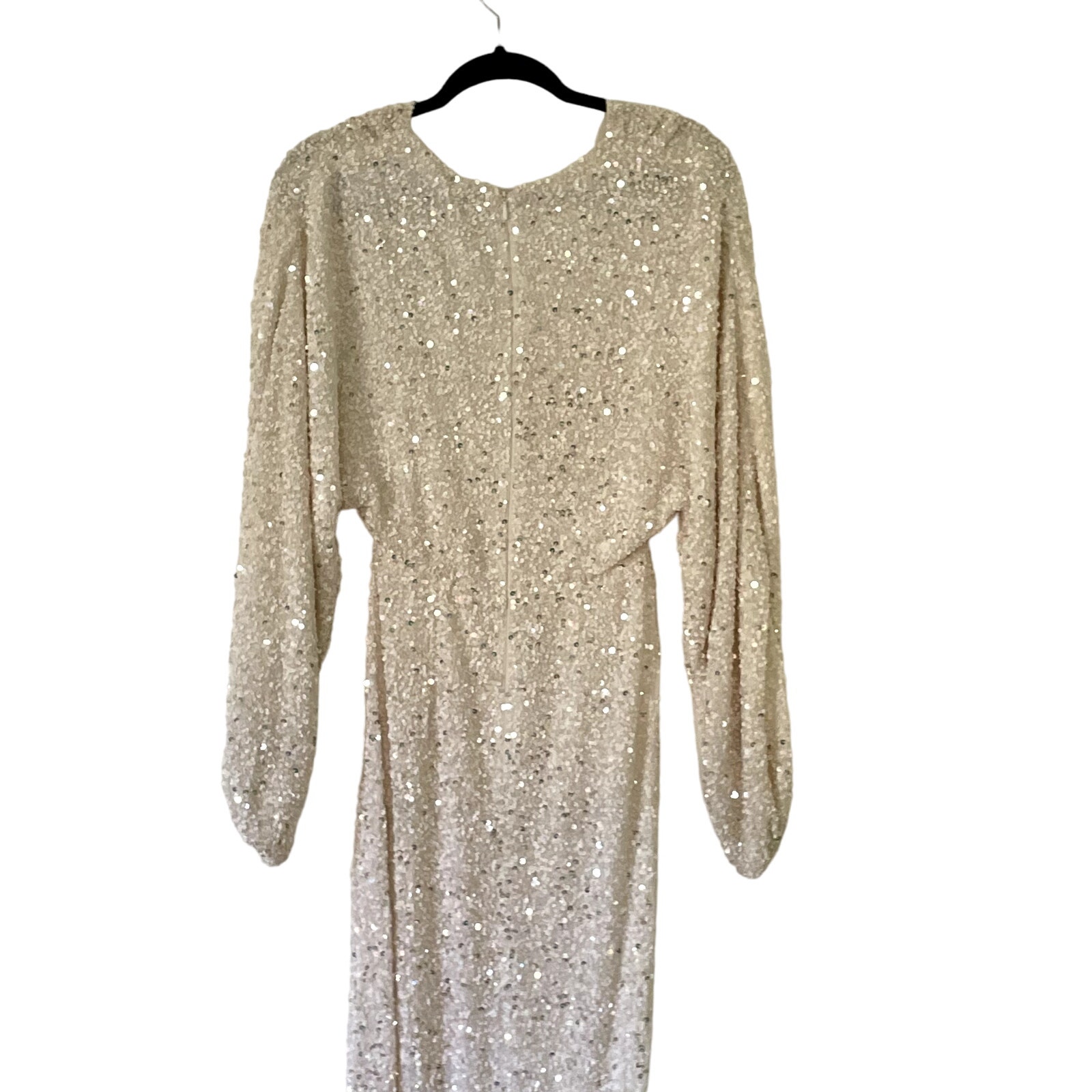 Stunning Retrofete Camille dress in size small. This white sequin chiffon maxi gown is perfect for any special occasion. Embellished with intricate detailing and featuring long sleeves, this dress offers a sophisticated and glamorous look.