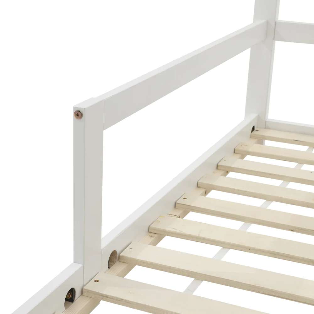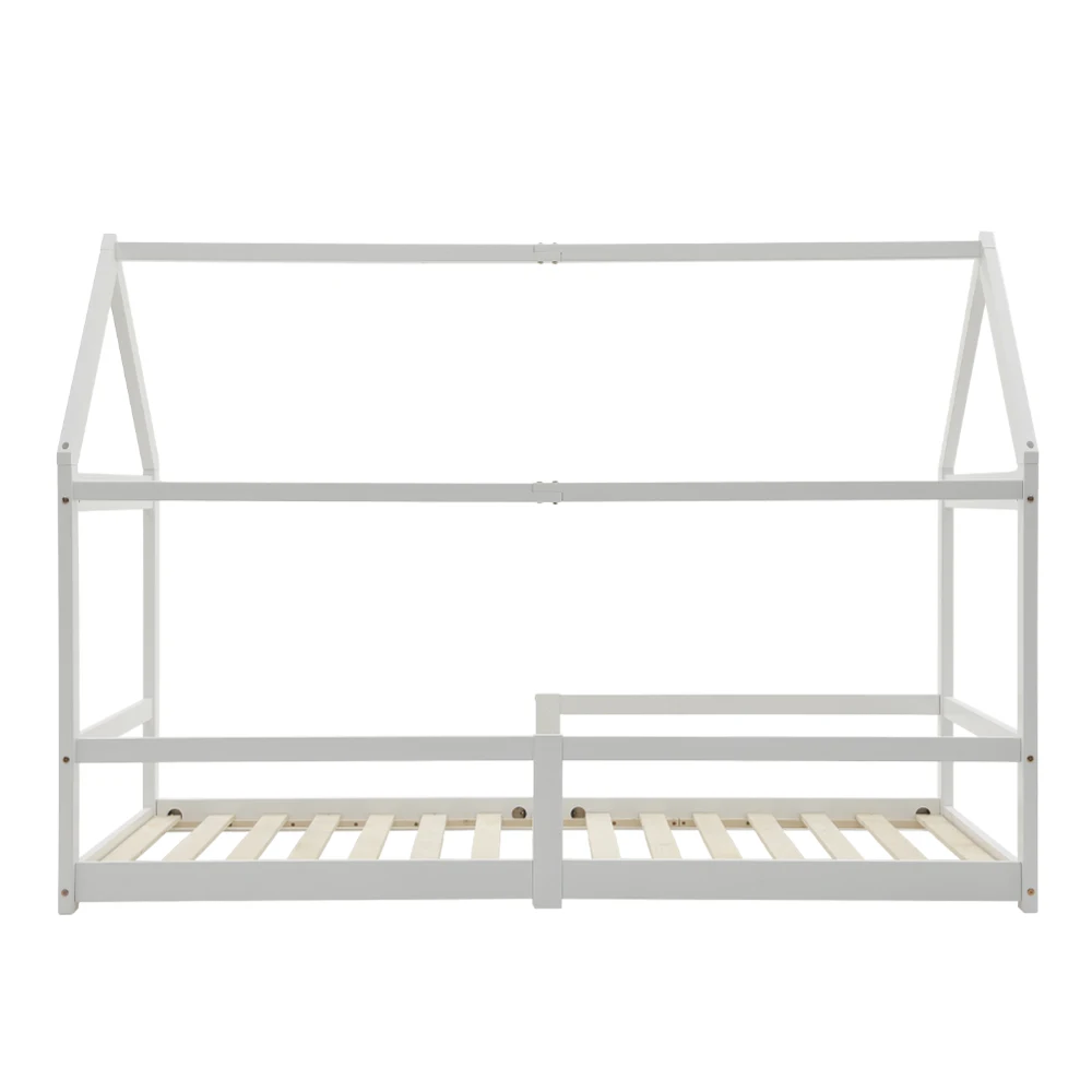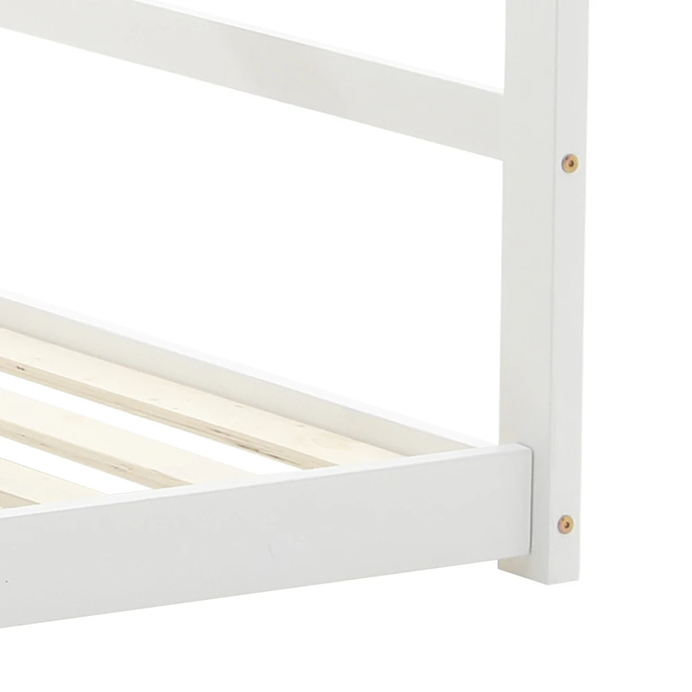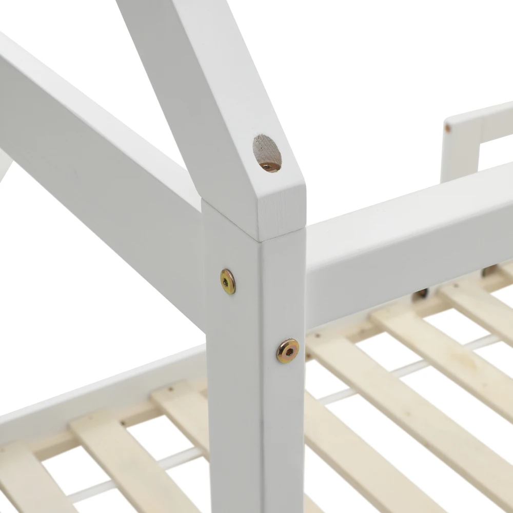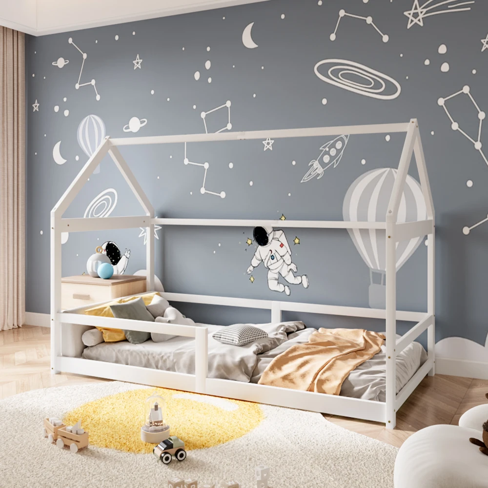 Create a happy and comfortable space for your child to sleep on with the house bed. Crafted from high-quality natural pine wood, it boasts a strong structure to withstand the weight and playful activities of children. With the addition of a suitable mattress, children can engage in independent play for extended periods and easily transition to rest when needed. The bed features a lovely triangular roof design that captures children's attention, making it an inviting addition to their room.