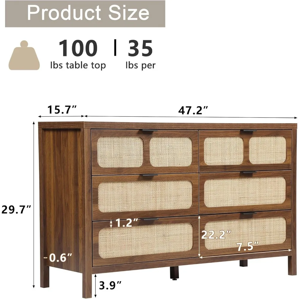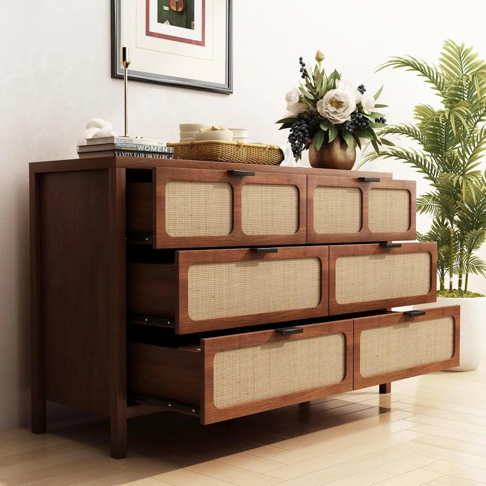 6 Drawer Dresser, Modern Rattan Dresser Chest with Wide Drawers and Metal Handles, Farmhouse Wood Storage Chest of Drawers for B