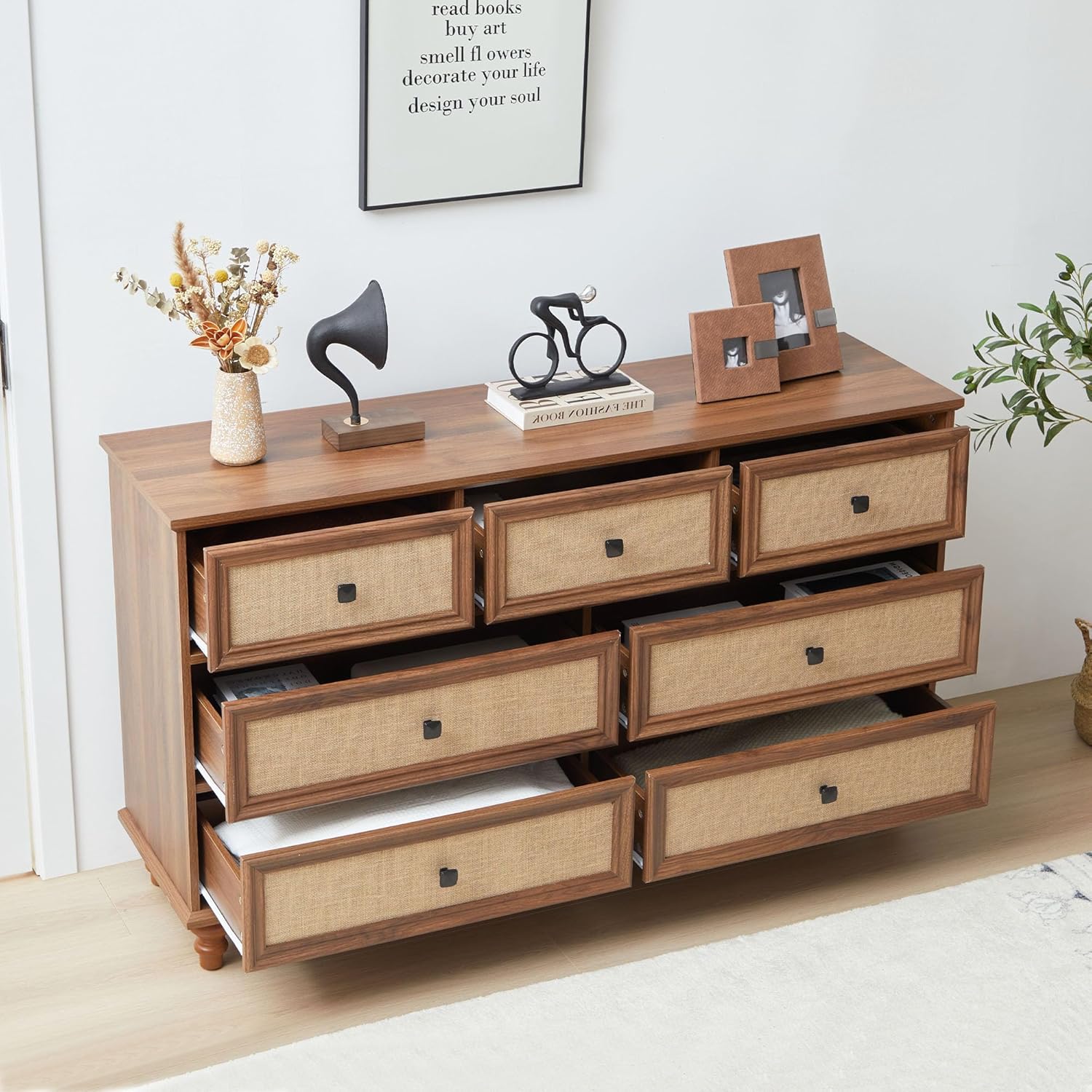 7 Drawer Dresser For Bedroom, Mid Century Modern Wide Wood Rustic Chest Of Drawers Wooden Storage Organizer Dressers With Burlap Rattan Drawers For Living Room, Hallway Closet, Entryway, Walnut