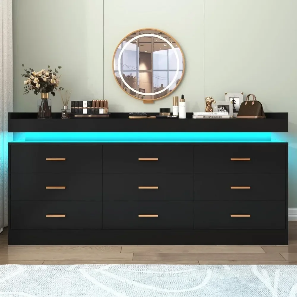 Modern Dresser 9 Drawer with LED Light,Wide Drawer Organizer Cabinet for Bedroom Living Room Chest for Closet of Wood Drawers