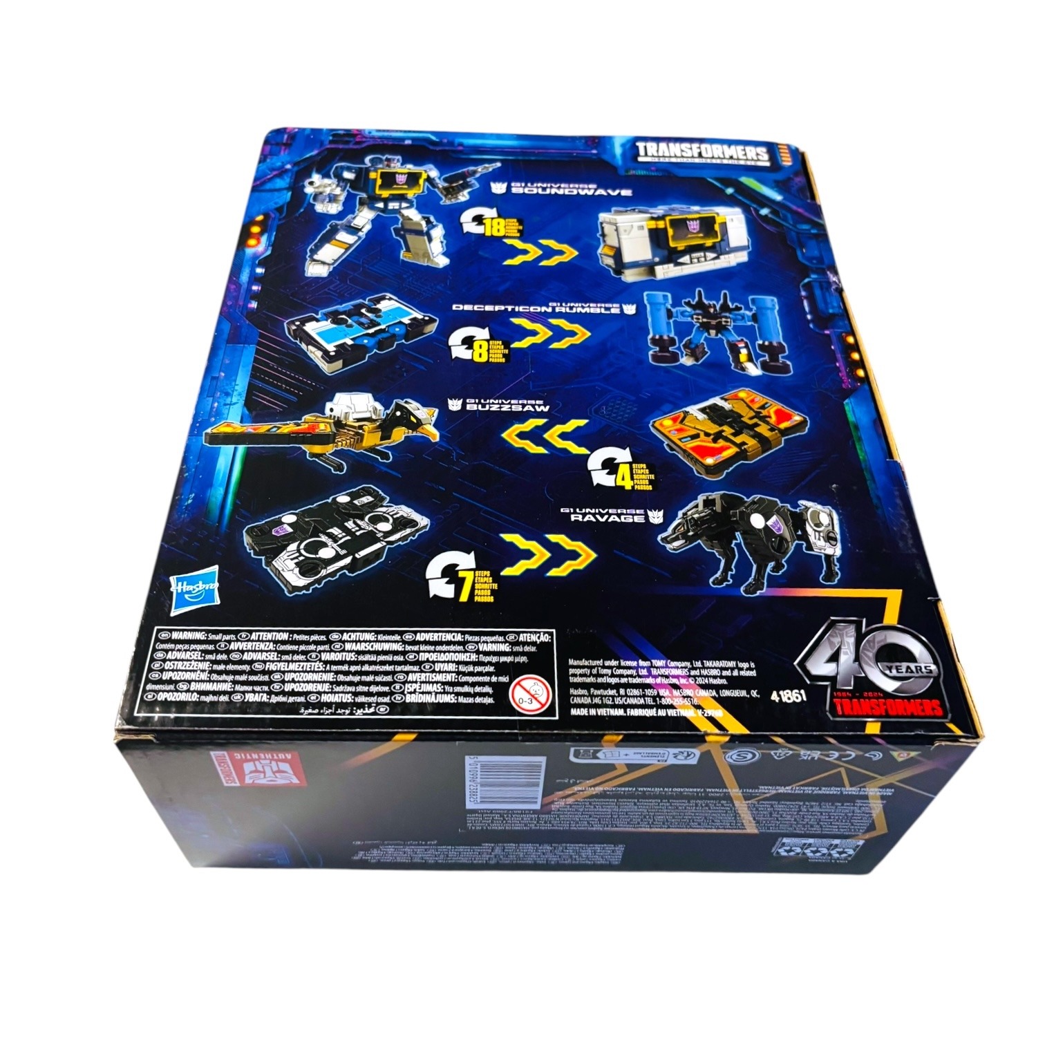 Unleash the power of the Decepticons with this Transformers Legacy United Soundwave & Cassette Bots 5-Pack. A nostalgic rush to the golden age of robots in disguise, this set revives the thrill of transforming action figures and epic battles between Autobots and Decepticons. Soundwave, the master of sonic surveillance, comes with his loyal cassette minions: Rumble, Ravage, Buzzsaw, and Laserbeak. This complete set is perfect for collectors seeking to relive their childhood memories or for new fans eager to discover the timeless charm of Transformers. Imagine displaying this iconic set on a shelf, bringing a piece of Cybertronian history to your home or gifting it to the Transformers enthusiast in your life, sparking joy and countless hours of imaginative play.