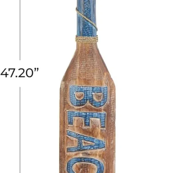 Number Of Items: 1Age Range Description: AdultUpc: 196877540777Item Type Name: Wall Decor Beach House Sign Wall Sculpture With Blue Accents And Rope DetailItem Height: 0.2 InchesRecommended Uses For Product: [Indoor]Indoor Outdoor Usage: IndoorMaterial: WoodFrame Material: WoodFinish Type: MattePaint Type: WatercolorPaper Finish: MatteCover Material: WoodSize: 6.1l" X 1.8w"Item Dimensions L X W: 6.1"l X 1.8"wItem Weight: 16 OuncesUnit Count: 1.0 CountOrientation: RoundItem Shape: RoundTheme: NauticalWall Art Form: Wall Hanging DecorColor: BrownStyle: NauticalRoom Type: Living RoomPattern: AbstractFrame Type: RoundSpecial Features: Wall DecorMounting Type: Wall DecorNAUTICAL THEME Inspired by blissful serenity and the allure of the sea, where the harmonious balance of brass and natural textures bring the desired essence of boat life to the homeMADE OF WOOD This brown home wall decor is expertly crafted from albizia wood, lending it an authentic, natural feelBROWN AND BLUE MATTE FINISH Round decor for walls exudes a rustic charm with its matte brown finish, contrasted beautifully by the touch of blue paintPADDLE ROUND WALL DECOR Blue accents and rope detail are standout features of this wood wall decor, enhancing its nautical themeLARGE SIZE The brown wood wall decor measures 6.10L x 1.80W x 47.20H inches, and weighs 1.45 lbsThis paddle wall sculpture would be a perfect addition to your living room, adding an element of nature and tranquility