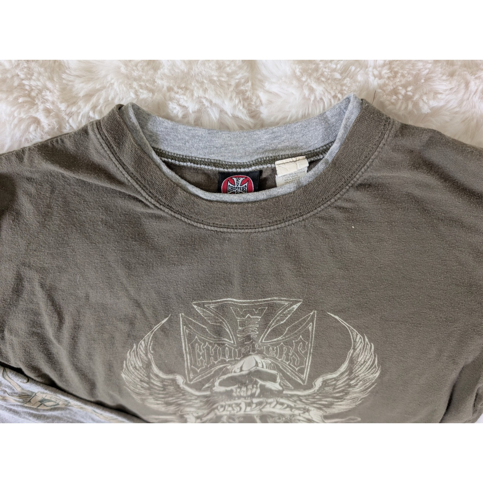 Vintage Y2K faux layered shirt in olive green with contrasting grey sleeves and neckline. Classic moto style shirt that features a front graphic with a winged skull and iron/Maltese cross WCC logo. Both sleeves have screen printed "por vida" graphics, and the back includes another WCC iron cross logo.
